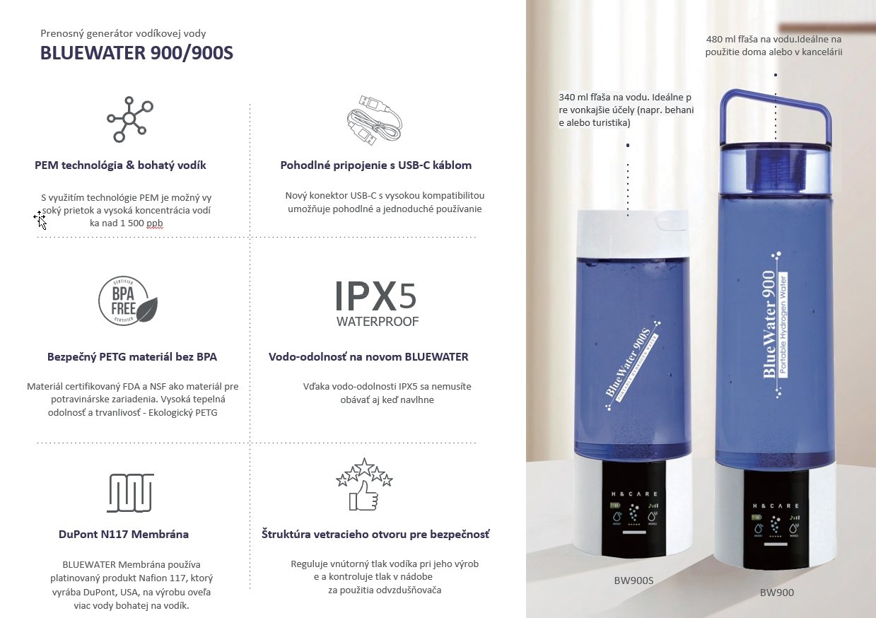 - Prenosnosť a všestrannosť: S hmotnosťou iba 350 gramov a kompaktnými rozmermi 75 x 265 x 75 mm je BlueWater BW900 ideálny na cestovanie. Zariadenie možno ľahko pribaliť do tašky či kufra a mať tak prístup k čerstvej vodíkovej vode kdekoľvek a kedykoľvek.